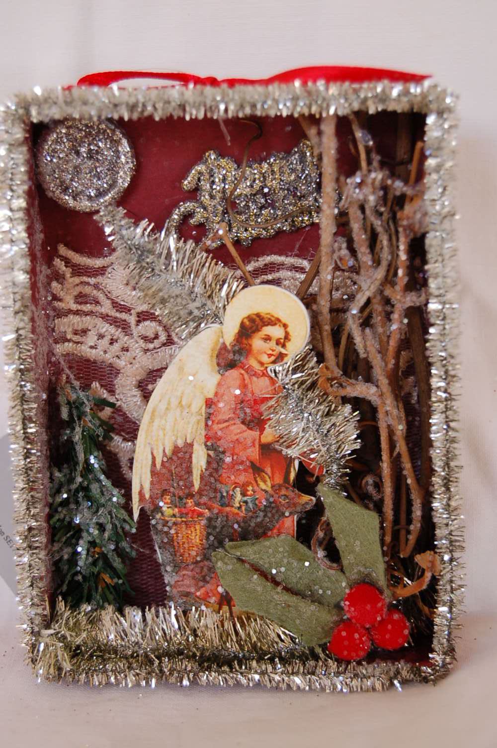 Gisela graham nostalgische wandhanger tafereel engel, materiaal hout met zilverdraad omlijst. Kan opgehangen worden of neergezet.