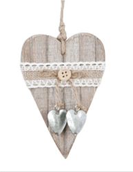 Leuke houten hangertje met lint, knoopje en 2 metalen hartjes, 11x8 cm